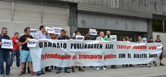 Garraio Publikoko enpresa batzorde guztiek ELA, LAB, CCOO, UGT, ESK eta USO sindikatuek joan den martxoan Bizkaian txartel bakarraren alde egindako adierazpenarekin bat egiten dutela adierazteko elkarretaratzea egin zuten atzo Bilboko Plaza Biribilean. Raul Mendezek, Metroko LABeko delegatuak, komiteen irakurketa plazaratu zuen.