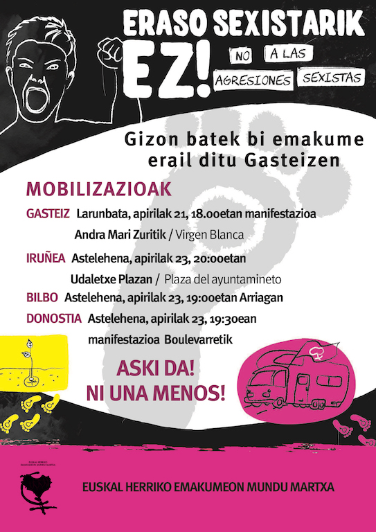 Gasteizen eraildako emakumeen eraso sexista salatzeko elkarretaratzeak egingo ditugu gaur Donostian, Bilbon eta Iruñean, Emakume Mundu Martxak deituta. Larunbatean, Gasteizen mobilizatu ginen.