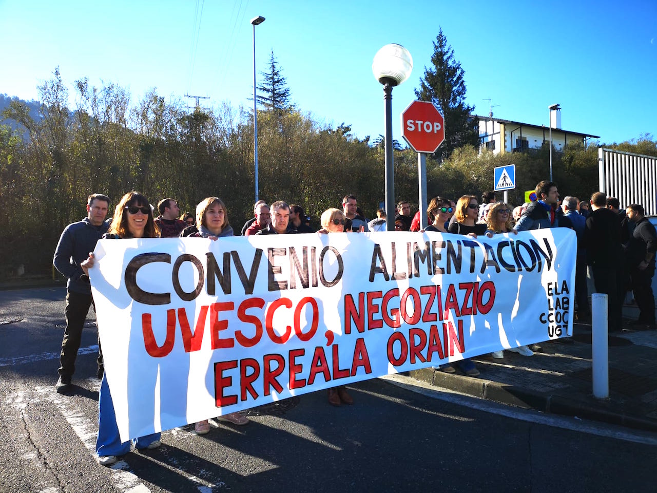 LAB, ELA, CCOO eta UGT sindikatuok elkarretaratze bat egin dugu Irunen, Uvesco enpresaren aurrean, Gipuzkoako elikagaien industria eta merkataritzako hitzarmenean benetako negoziazioa eskatzeko. Adegiren egoitzaren aurrean egin genuen protesta joan den astean, Donostian, eta, negoziazioan jarrera aldaketarik egon ez denez, beste mobilizazio bat egin dugu gaur.