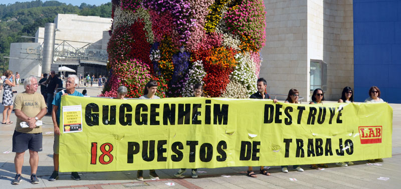 18 lanpostu suntsitu dituzte Eusko Jaurlaritza, Bizkaiko Foru Aldundia eta Bilboko Udalaren babesarekin. Hau da Bilboko Guggenheim Museoak eta Eusko Alderdi Jeltzaleak guztion artean ordaintzen ditugun zentro kulturaletako laneko prekarietateari ematen dioten konponbidea, grebalarien lanpostuak ezabatu, euren kalitate eta bikaintasun eredua zein den argi utziz.