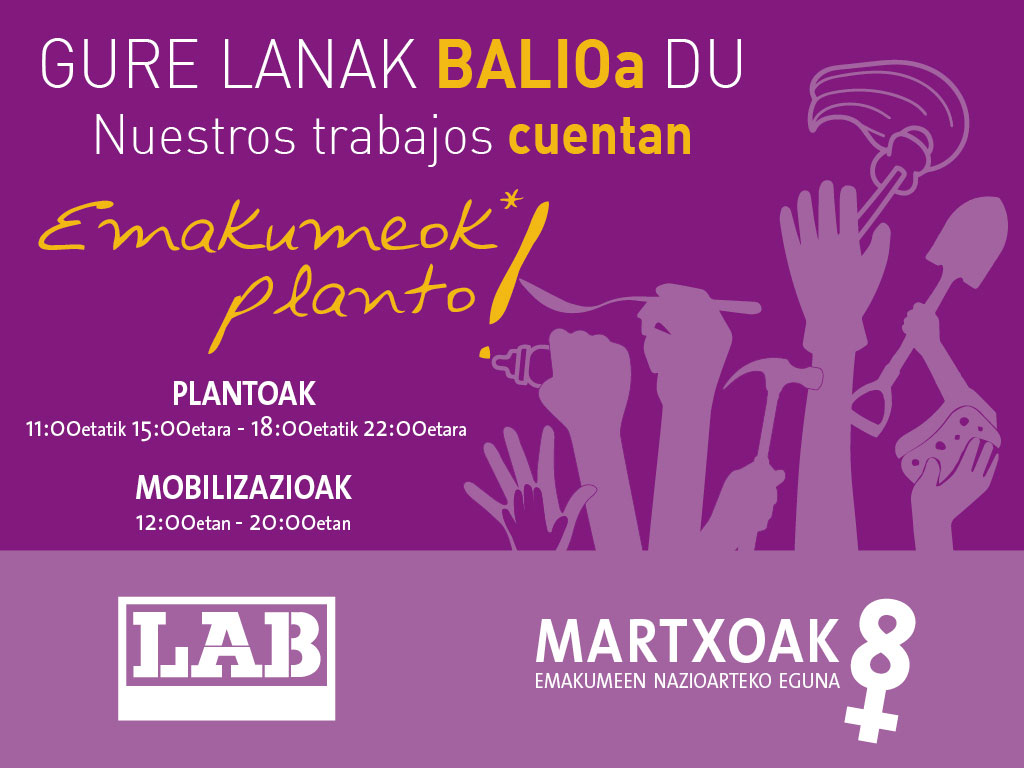 InicioMujeresMartxoak 8Gure lanak balioa du, nuestros trabajos cuentan. Emakumeok* planto! #GrebaFeministarantz