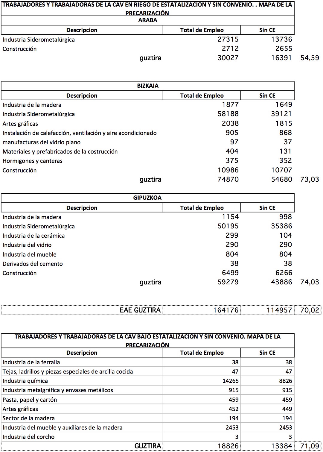 Según datos del CRL; en la CAPV hay 114.947 trabajadores en la industria bajo amenaza de estatalización, es decir, el 70% de los y las trabajadoras. Sin embargo, 13.384 ya tienen sus condiciones laborales reguladas en convenios estatales. En Nafarroa, los y las trabajadoras de químicas y de artes gráficas dependen directamente de convenios estatales (4.240 personas) y están bajo su amenaza en el metal y la construcción (aproximadamente 54.000).