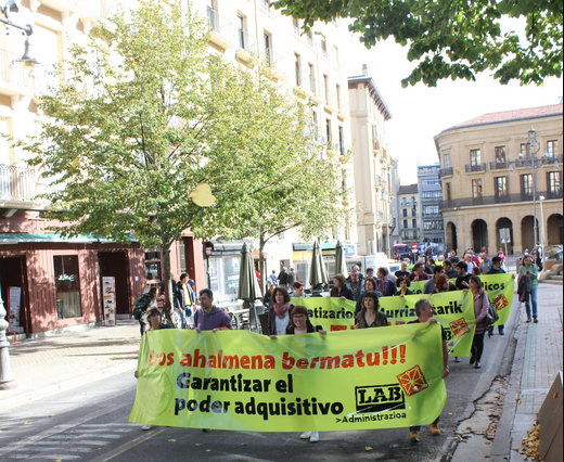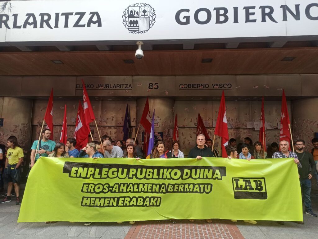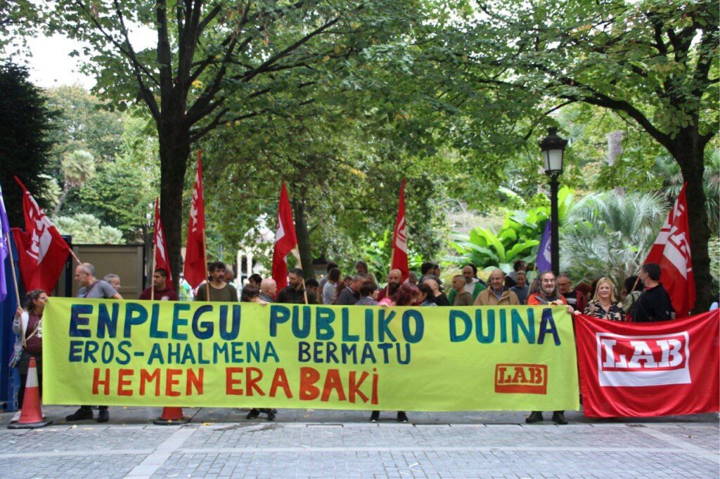 Las delegadas y delegados de LAB han comenzado ya a movilizarse para reivindicar unas condiciones laborales dignas en los servicios públicos en las administraciones y en las empresas públicas de Euskal Herria. Frente al Gobierno de Navarra en Iruñea, en la ante el Ayuntamiento de Gasteiz, en la plaza ante la Diputación Foral de Gipuzkoa en Donostia y ante el Gobierno Vasco en Bilbo, hemos iniciado una dinámica de movilizaciones con cuatro concentraciones. Sin recortes, reivindicamos salarios y empleos dignos y exigimos a las administraciones de la CAPV y Nafarroa que inicien procesos de negociación sin imposiciones en todos sus ámbitos. «Empleo público digno, garantía de poder adquisitivo, aquí decidimos», ése ha sido el lema de las movilizaciones de hoy.