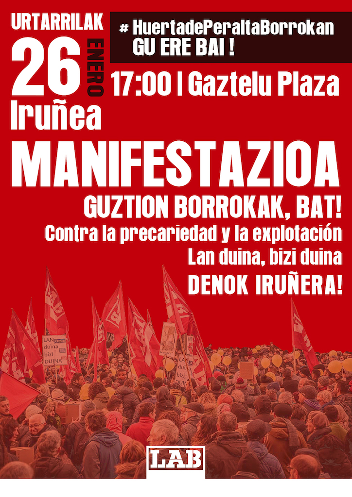 LAB convoca una manifestación nacional para el 26 de enero, día en el que las y los trabajadores de Huerta de Peralta cumplen un mes desde que iniciaran la huelga indefinida. Se trata de un día señalado, por lo que tenemos una gran oportunidad para acercarnos a Iruñea desde todos los rincones de Euskal Herria y dar impulso a la lucha sindical contra la precariedad y la explotación.