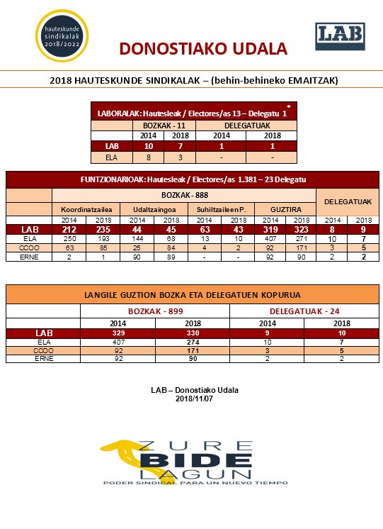 En cuanto a los resultados, queremos recordar que las cuatro mesas de las elecciones en el Ayuntamiento, LAB ha ganado en tres de ellas y en la cuarta se ha mantenido con la misma representación que hace cuatro años.