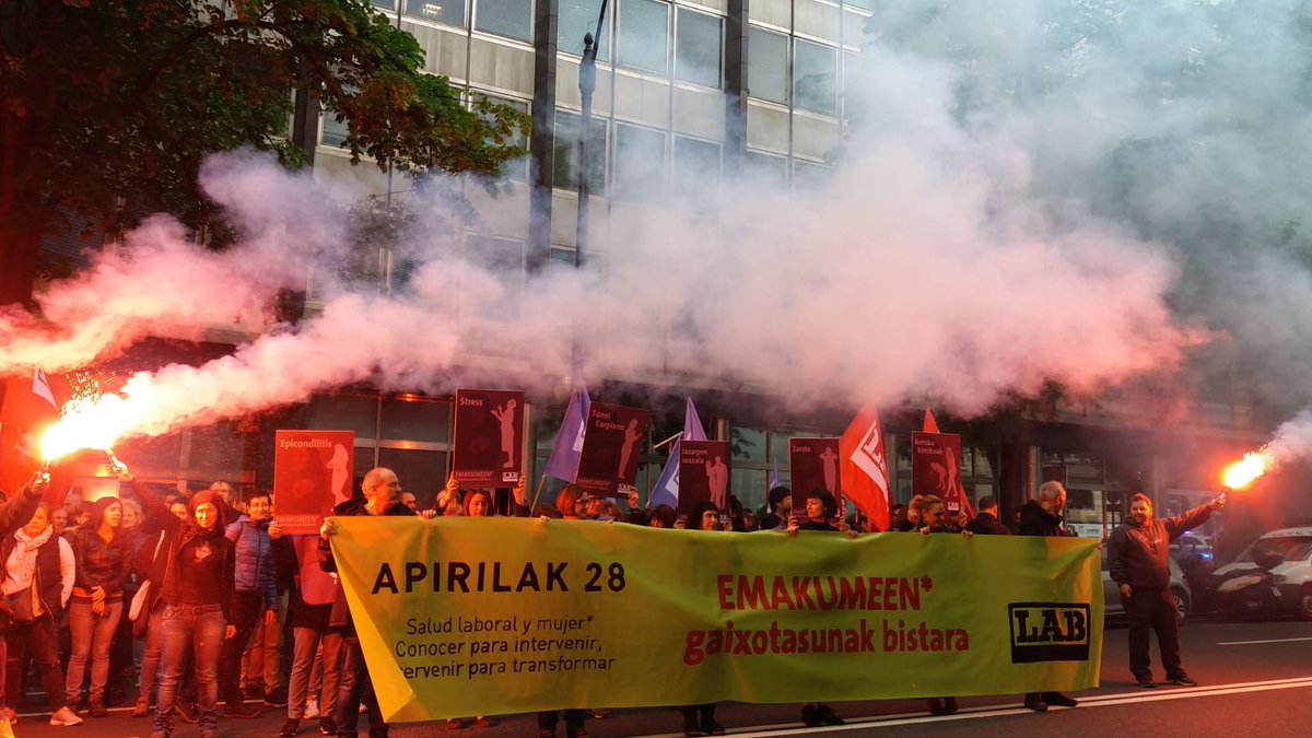 En esta ciudad, la protesta de LAB ha finalizado ante la mutua IMQ y ante esta, se ha realizado una performance para representar las enfermedades y riesgos que sufrimos las mujeres en el trabajo. Han colocado una pancarta en la mutualidad y encendido algunas bengalas. Entonces ha aparecido la Ertzaintza identificando a dos miembros de LAB. Aunque éstos les han señalado que se trataba de un elemento de la propia movilización y que ésta estaba previamente comunicado, han entrado al interior y le han dicho a un trabajador de la mutua que llamara al servicio de urgencias ya que, al parecer, había entrado humo al edificio. Al de pocos minutos han hecho su aparición dos camiones de bomberos, un coche de los mismos y una ambulancia con las sirenas encendidas. Cuando éstos han visto que les han llamado porque media hora antes habían encedido dos bengalas (similares a las utilizadas en partidos de fútbol) y que allí no había nada, se han marchado.