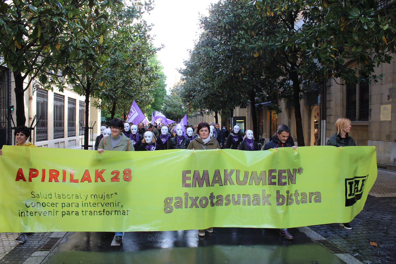 En vísperas del Día Internacional de la Salud en el Trabajo, nos hemos movilizado en las cuatro capitales de Hego Euskal Herria para denunciar que la salud laboral de los y las trabajadoras está empeorando año tras año. Este año hemos querido hacer visibles las enfermedades que sufren las mujeres, para dar a conocer las consecuencias en la salud de la falta de igualdad ques sufren tanto en sus puestos de trabajo como a nivel social. Así, la secretaria general de LAB Garbiñe Aranburu ha tomado la palabra en la movilización de Donostia, ante la sede del Gobierno Vasco y ha señalado cuáles son las medidas necesarias; entre otras, hacer visibles los problemas ergonómicos, psicosociales y químicos, entre otros.