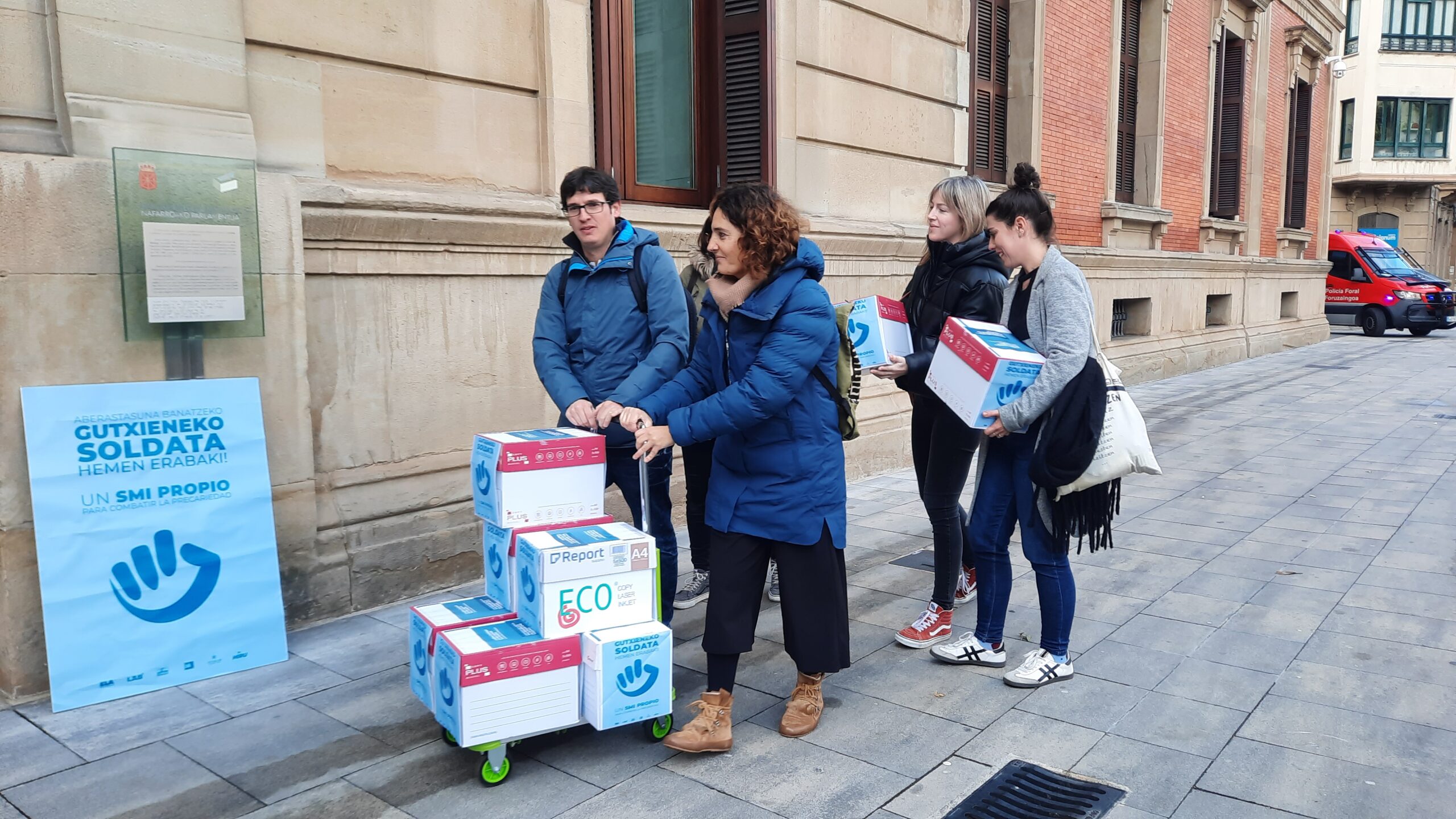 Los sindicatos ELA, LAB, ESK, Steilas, Etxalde y Hiru han presentado hoy en el Parlamento de Navarra las firmas recogidas a favor de un Salario Mínimo propio. Las y los trabajadores navarros han apoyado de forma muy amplia esta reivindicación: una herramienta útil para reducir la brecha salarial, poner límites a la precariedad, disminuir la pobreza y repartir la riqueza de manera más justa.