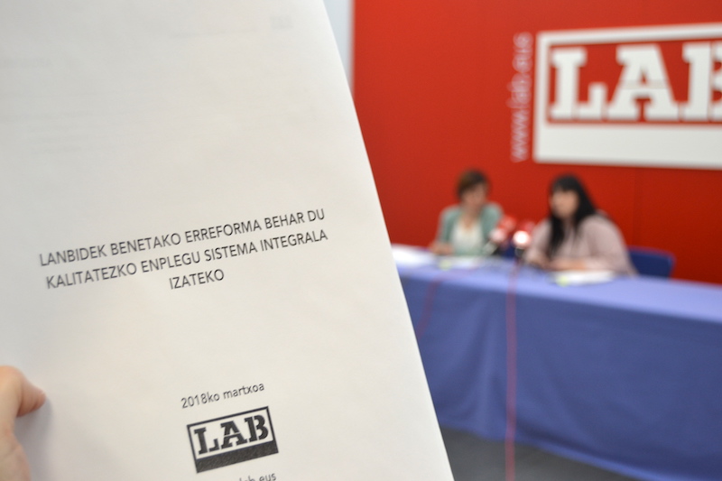 LAB ha comparecido hoy en Bilbo para presentar su propuesta de reforma para Lanbide, recogida en el documento “Por una reforma real de Lanbidepara conformar un sistema público de empleo integral de calidad”. En este documento, además de la valoración de la propuesta para Lanbide realizada por el gobierno, se recoge el modelo que propugna LAB. En la comparecencia de hoy, han intervenido Bea Martxueta, secretaria de Acción Social y Eider Casanova, adjunta del secretario de la Federación de Servicios Públicos.