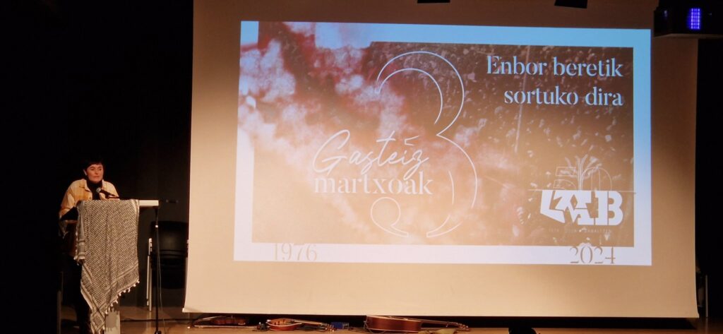 LAB ha realizado un acto en Gasteiz, en el 48 aniversario de la masacre del 3 de Marzo, con el lema Enbor beretik sortuko dira. La coordinadora general Garbiñe Aranburu ha participado en el mismo y ha señalado que en 1976 el sindicato estaba recién creado: “Desde un principio teníamos claro dónde estaba nuestro sitio, tomamos parte en el 3 de marzo de 1976 y para LAB sigue siendo una fecha importante”.