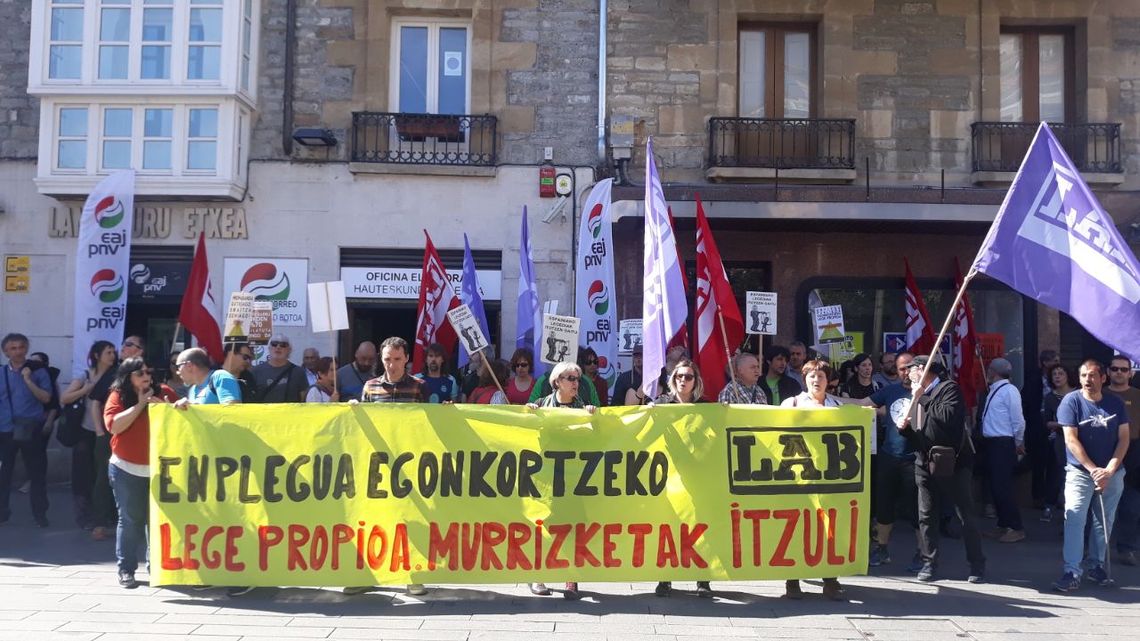 Delegados y delegadas de LAB en los servicios públicos ha reivindicado en Gasteiz una ley propia para dotar de estabilidad al empleo en el sectro público. Partiendo desde el hospital de Gasteiz y pasando ante la sede del PNV, han llevado su protesta hasta las puertas del parlamento. De hecho, en LAB apostamos por una ley específica que acabe con la inestabilidad y la precariedad que sufren trabajadoras y trabajadores interinos en los servicios públicos. Por otro lado, cuando el Gobierno Vasco está diseñando las principales líneas de los presupuestos, también es momento para poner en marcha planes de empleo integrales y revertir los recortes. Así, ya hemos pedido una reunión urgente de mesa general para tratar estos temas.