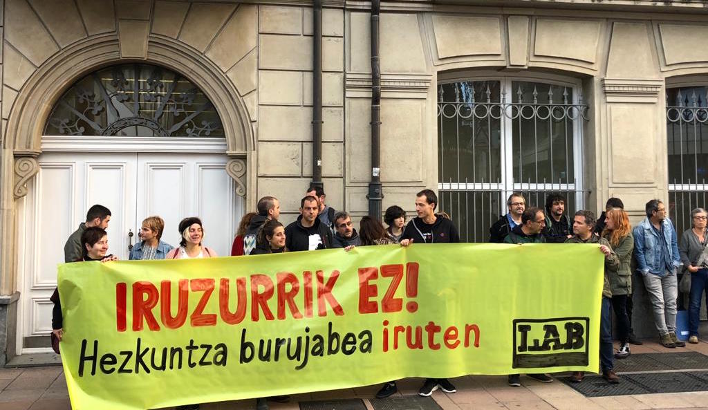 LAB se ha concentrado hoy ante el Parlamento de Gasteiz con el lema “No al fraude, tejiendo la educación soberana”, con motivo del monográfico sobre el Acuerdo de Educación previsto en la cámara.