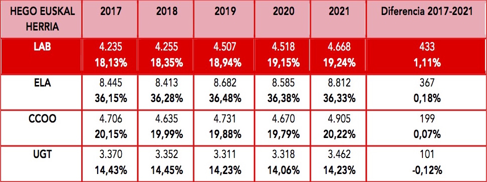 En cuanto a las elecciones sindicales en Hego Euskal Herria, LAB ha cerrado el año con 4.668 delegados y delegadas, de las que el 37,22% son mujeres y el 62,78% hombres. Hemos terminado 2021 con 150 más que el año pasado y 433 más que hace cinco años. En porcentaje, ha obtenido el mejor resultado de su historia, el 19,24%.