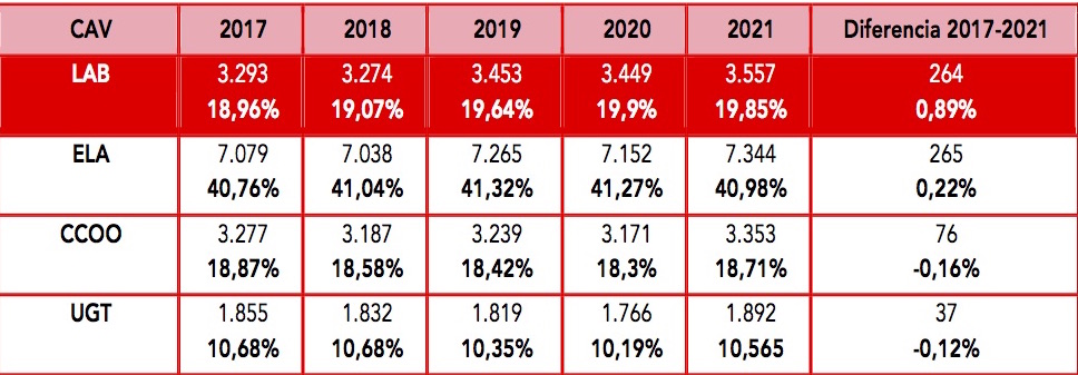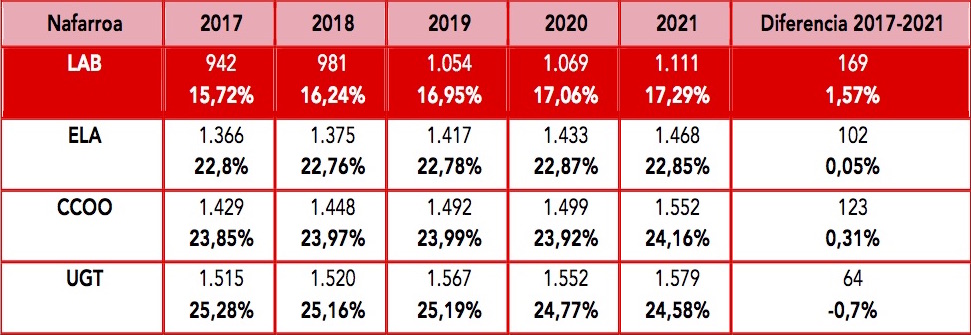 En cuanto a Nafarroa, LAB ha obtenido 50 delegados y delegadas más que el año anterior y 169 más que hace cinco años. Con un porcentaje del 17,33%, LAB está a 7 puntos del primer sindicato.