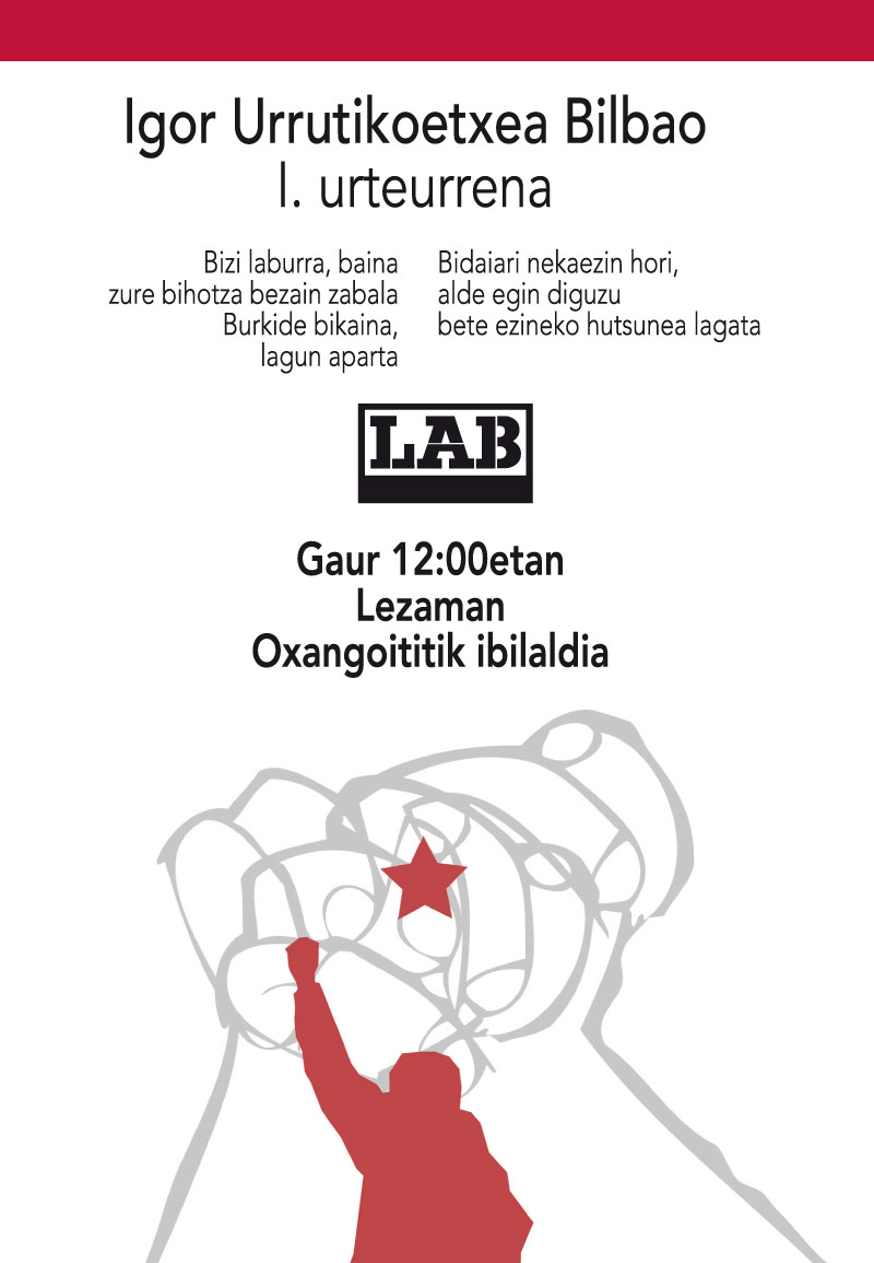 InicioSindicato LABIgor UrrutikoetxeaIgor Urrutikoetxea, beti gogoan Igor Urrutikoetxea Igor Urrutikoetxea, beti gogoan Cuota WhatsAppFacebookTwitterEmailImpresiónTelegram 2014-11-29 0 Gaur, azaroak 29, zapatua, Igor Urrutikoetxea Bilbao gogoratu eta omentzeko ibilaldia antolatu dute Lezamako lagun eta ingurukoek. «URRUTI, beti gogoan beti bihotzean» 12:00etan emango zaio hasiera ibilaldiari Lezamako Oxangoiti Kultur Elkartean. Cuota WhatsAppFacebookTwitterEmailImpresiónTelegram Artículo anteriorLa dimisión de Mario Fernandez debe aprovecharse para dar marcha atrás en el proceso de privatizaciónArtículo siguienteIgor Urrutikoetxearen omenezko ekitaldiak Zornotza eta Lezaman, bere heriotzaren lehen urteurrenean Tagsigorigor-urrutikoetxeaSindicato LABInternacional AZKEN ALBISTEAK | ÚLTIMAS NOTICIAS LAB ha participado en el congreso de la central sindical chipriota PEO 2025-12-05 El coordinador general de LAB, Igor Arroyo, se ha sumado a la reivindicación de unidad y autodeterminación de Chipre en en el congreso de... La pretensión de llevar la Ley de Empleo Público al Tribunal Constitucional español supone un agravamiento de la ofensiva judicial contra el euskera 2025-12-05 En contra de la opinión de la sociedad vasca y de la mayoría de los empleados públicos, la resolución podría prohibir situar el euskera... LAB denuncia de forma rotunda que hayan dejado a 111 personas en la calle en el barrio de Martutene de Donostia 2025-12-04 LAB recuerda que toda la ciudadanía tiene derecho a tener una vida que merezca ser vivida, y ha reclamado a las instituciones que lo...
