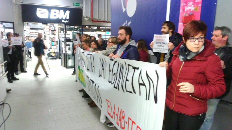 Ireki berri duten supermerkatuko arduradunek jai egunetan eta igandeetan irekitzeko asmoa zutela adierazi zuten inaugurazioaren aurretik. Bada, iragarpena bete dute eta atzo, igandearekin, autobus geltokiko BM berriak ateak zabaldu zituen. Hori dela eta, egun batzuk lehenago egin bezala, LAB, ELA eta CCOO sindikatuok deituta, protesta egin genuen atariaren aurrean.