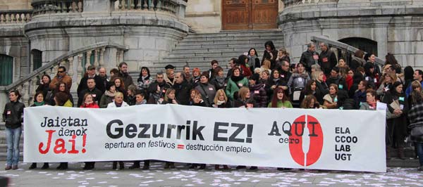 Hoy 26 de Enero, con motivo del pleno que se celebraba en el ayuntamiento de Bilbao, los sindicatos LAB, CCOO, UGT y ELA nos hemos concentrado para reiterar a esta institución el rechazo mayoritario de la sociedad a la apertura de comercios en Domingos y Festivos.