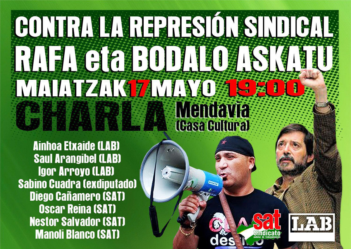 Datorren maiatzaren 17an "Contra la represión sindical Rafa eta Bodalo askatu" izenburupean jazarpen sindikalaren aurkako hitzaldia egingo da Mendabiako Kultur Etxean. LAB sindikatuak eta Andaluziako SATek antolatutako ekimenari arratsaldeko 19:00etan emango zaio hasiera. Bertan, besteak beste, Ainhoa Etxaide eta Diego Cañamero izango dira.