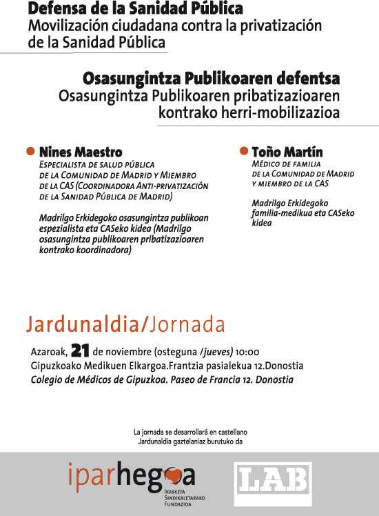La Fundación Ipar Hegoa ha organizado una Jornada para analizar la importancia de la movilización ciudadana en defensa de la sanidad pública. El la Jornada participarán, presentando la experiencia de movilización ciudadana contra la privatización de la sanidad pública en Madrid, los miembros de la Coordinadora Anti-privatización de la Sanidad pública de Madrid Nines Maestro y Toño Martín.