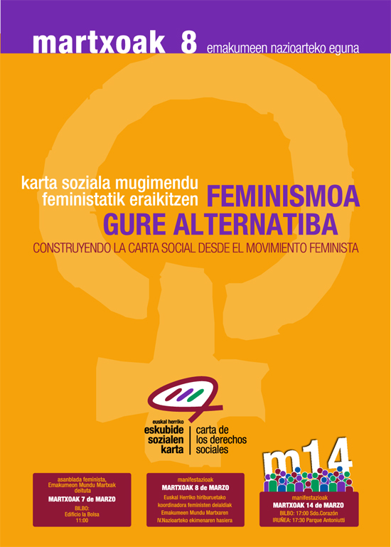 Aurtengo martxoaren 8 honetan, feministok aldarrikatzen dugu beste eredu ekonomiko eta sozial baten eraketan emakumeok nahitaezko subjektu politikoak garela eta Euskal Herriko Karta Sozialaren eraikuntzan feminismoa ezinbestekoa dela. Hau dela eta, Martxoaren 14ean emakumeok ere kaleak okupatuko ditugu aldaketa feminista ez bada ez delako benetako aldaketa izango.