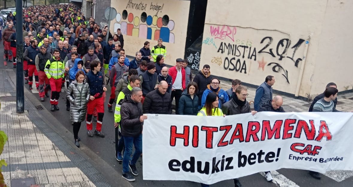 Tras el rechazo de las asambleas de fábrica a la propuesta de ELA y CCOO para interrumpir las movilizaciones programadas para las últimas dos semanas, hoy 29 de noviembre hemos vivido una nueva y exitosa jornada de paros en las plantas de CAF de Beasain, Irun y Castejon en la cual se ha realizado una manifestación por las calles de Ordizia. Después, la empresa ha convocado para este viernes el comité intercentros a una nueva reunión negociadora.
