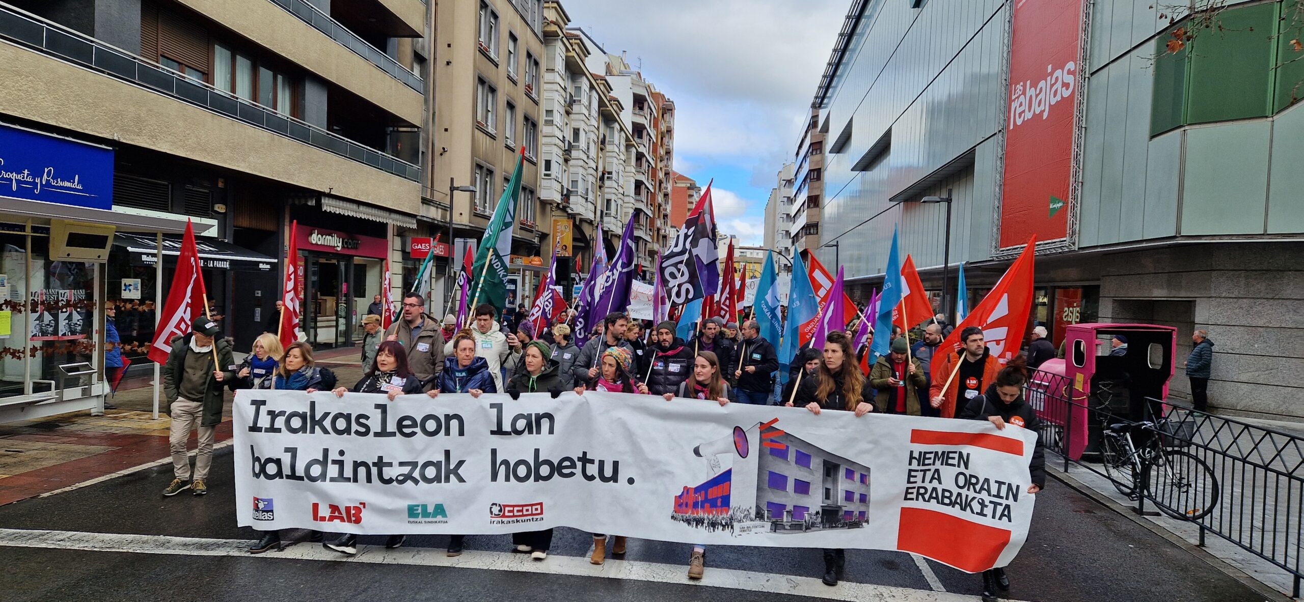 Araba: Salburua HLHH (90%); Lopez de Guereñu (82%); Umandi (74%); Zabalgana BHI (80%) en Gasteiz y Zabaleko en Amurrio (75%)- Las huelgas bajo el lema “¡Mejora las condiciones laborales, decidido aquí y ahora!” han sido un éxito. En las tres manifestaciones de hoy hemos reunido miles de trabajadores y trabajadoras en las calles de las capitales y estamos dispuestas a seguir con esta dinámica movilizadora.