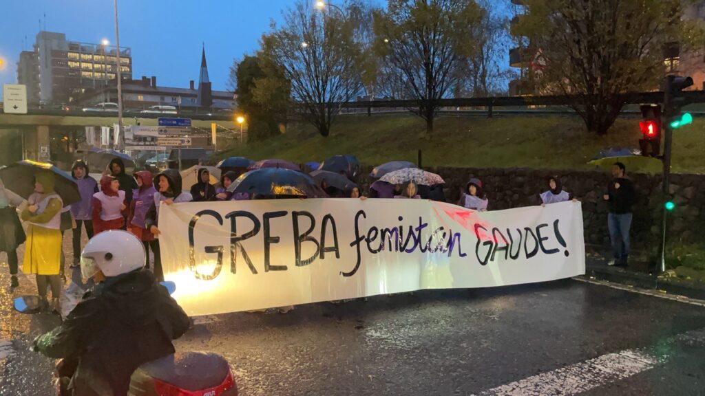 Hemos comenzado la jornada de huelga desde la mañana en cientos de rincones de Euskal Herria. A medianoche hemos escuchado caceroladas, de madrugada hemos visto hasta dulzaineros por las calles y finalmente nos hemos juntado en los piquetes. En esta huelga feminista general tenemos el objetivo de vaciar los centros de trabajo y tomar las calles. Hemos iniciado ya cientos de movilizaciones organizadas desde los Comités de Huelga de pueblos y barrios; hemos tomado carreteras, cerrado caminos, preparado desayunos y hecho piquetes informativos.
