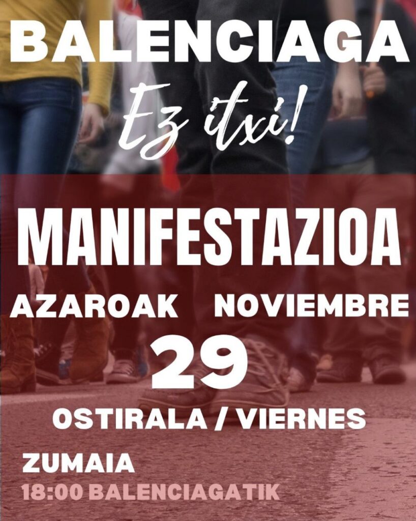 Por todo esto la plantilla de Balenciaga va a luchar por su futuro. El viernes 29 de noviembre a las 18:00 horas realizaremos una manifestación que saldrá del astillero. Llamamos a todo el pueblo de Zumaia y a la gente de Urola Kosta a acudir a esta manifestación en defensa de nuestros puestos de trabajo y de los de sus hijos e hijas en el futuro. Tened claro que la empresa es viable y que hay opciones para mantenerlo, por eso es importante que nos escuchen en Gasteiz y en Madrid. No se puede dejar sin futuro a tantas personas sin que a nuestros políticos le importe.