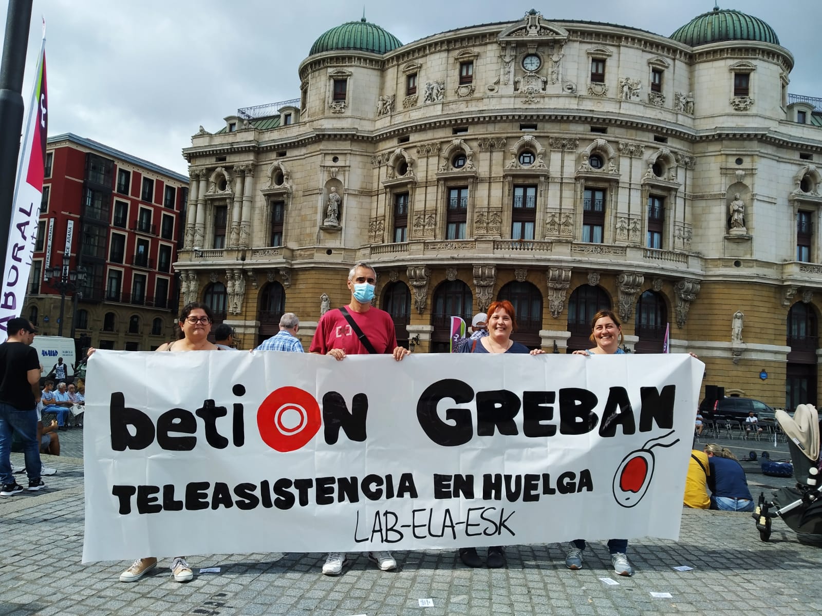 Los y las trabajadoras del servicio de teleasistencia de BetiON en Bizkaia, Araba y Gipuzkoa seguimos en huelga y en la Aste Nagusia de Bilbao también hicimos una concentración para denunciar la situación de inmovilismo y difundir la convocatoria de huelga de todo un mes para septiembre. El objetivo de las trabajadoras es mejorar nuestra situación material: garantizar el IPC en las bases salariales, reducir las horas de trabajo, etc.