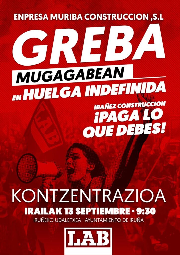 Las seis personas trabajadoras que aún quedan en la plantilla de la empresa de construcción Muriba S.L. están en huelga indefinida desde ayer dado que Ibañez Construcción, empresa matriz y del mismo dueño, les adeuda tres meses de sueldo. El sindicato LAB quiere denunciar firmemente la desfachatez de Ibañez Construcción, dado que a pesar de cobrar millones de euros para realizar obras públicas (Instituto Navarro de la Memoria, instituto de Lumbier…), ha decidido dejar caer a su filial y condenar a la precariedad a sus trabajadores.