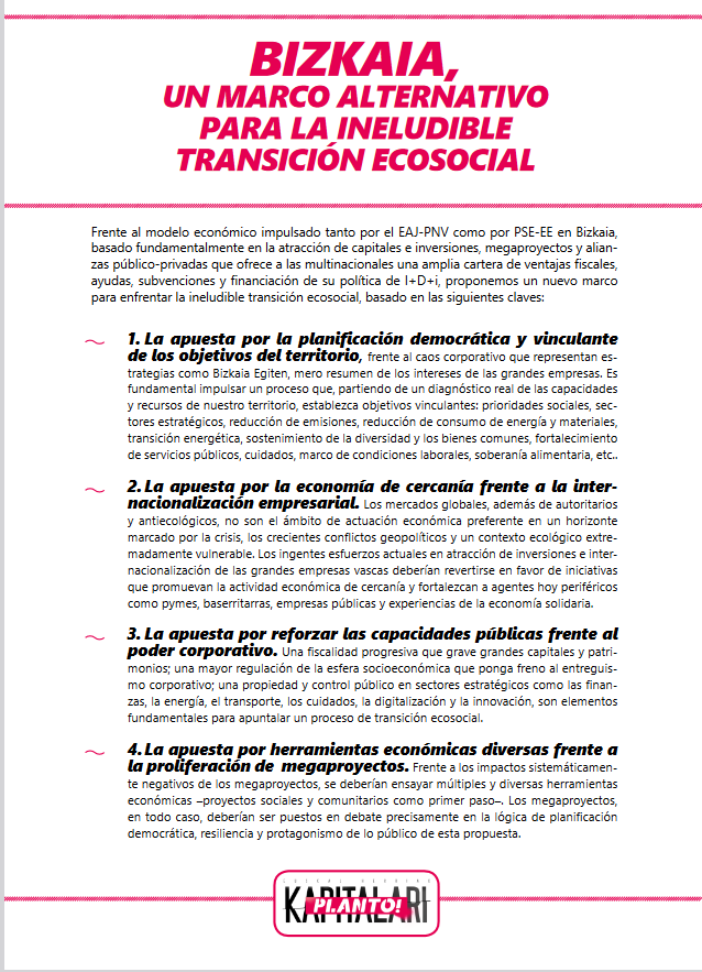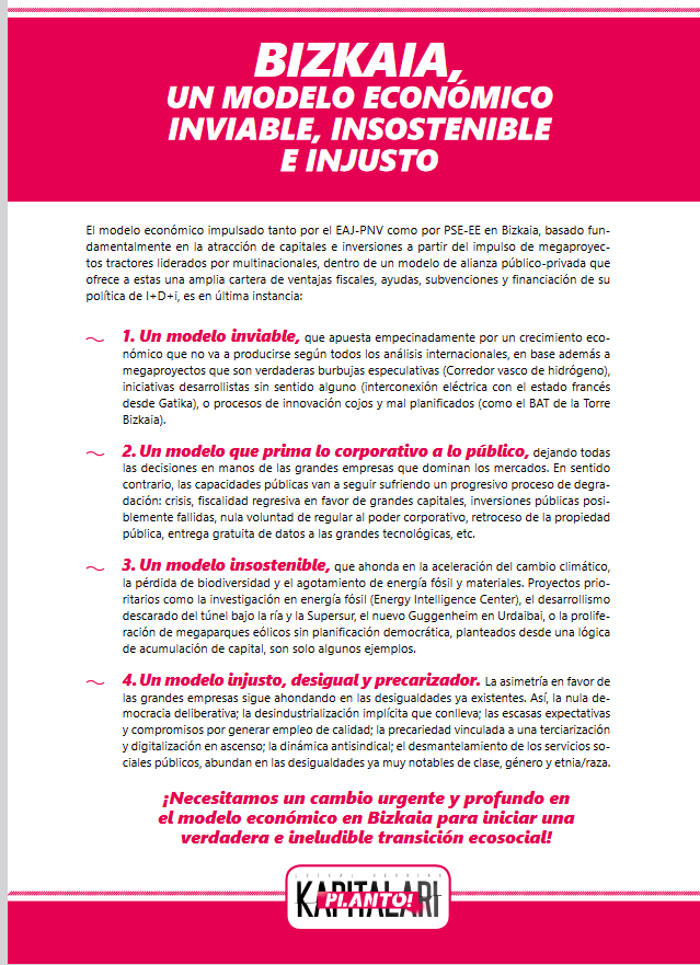 El modelo impulsado por el PNV y el PSE en Bizkaia está basado en poner alformbra roja a megaproyectos, al poder corporativo y a las grandes empresas, pasando por encima de las personas trabajadoras y el territorio. Frente a ello necesitamos un cambio de rumbo en pos de una transición ecosocial justa, impulsando una economía de cercanía y sostenible, y apostando por aumentar las capacidades públicas. También es imprescindible apostar por la planificación democrática vinculante, para que las personas trabajadoras seamos protagonistas de esta transición.