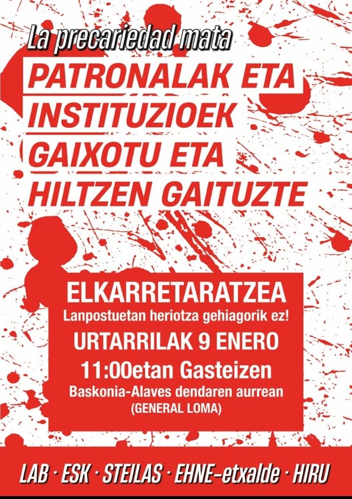 Este primer accidente mortal del año se ha producido en el sector de la construcción. En él la subcontratación tiene un impacto directo en la salud laboral y son habituales la falta de prevención, las deficientes medidas preventivas y la falta de recursos preventivos y de coordinación. Por ello, los sindicatos LAB, ESK, STEILAS, EHNE Etxalde e HIRU, que formamos la Intersindical, hacemos un llamamiento a la movilización, este jueves día 9 de enero a las 11:00 de la mañana en Gasteiz, frente a la tienda Baskonia-Alavés, en la Plaza General Loma.