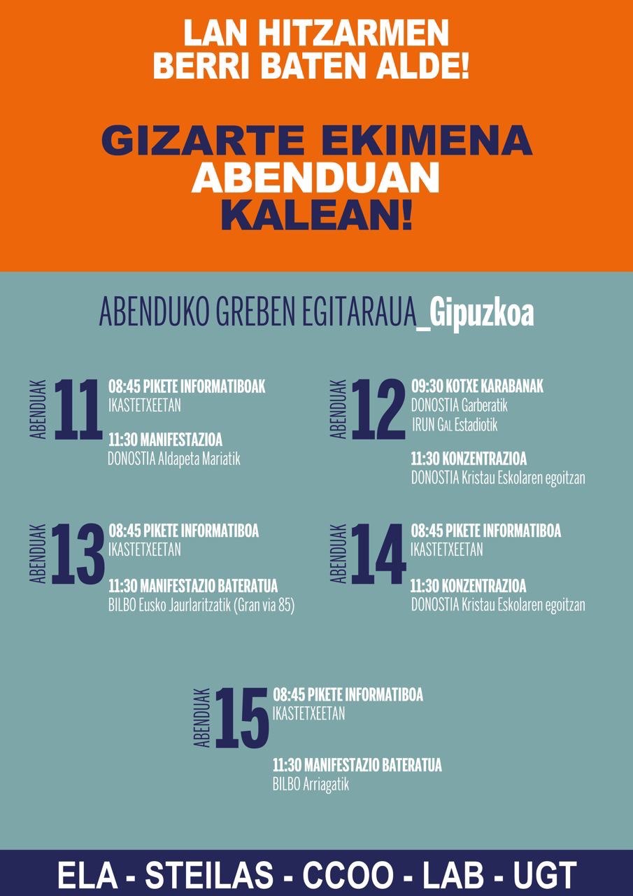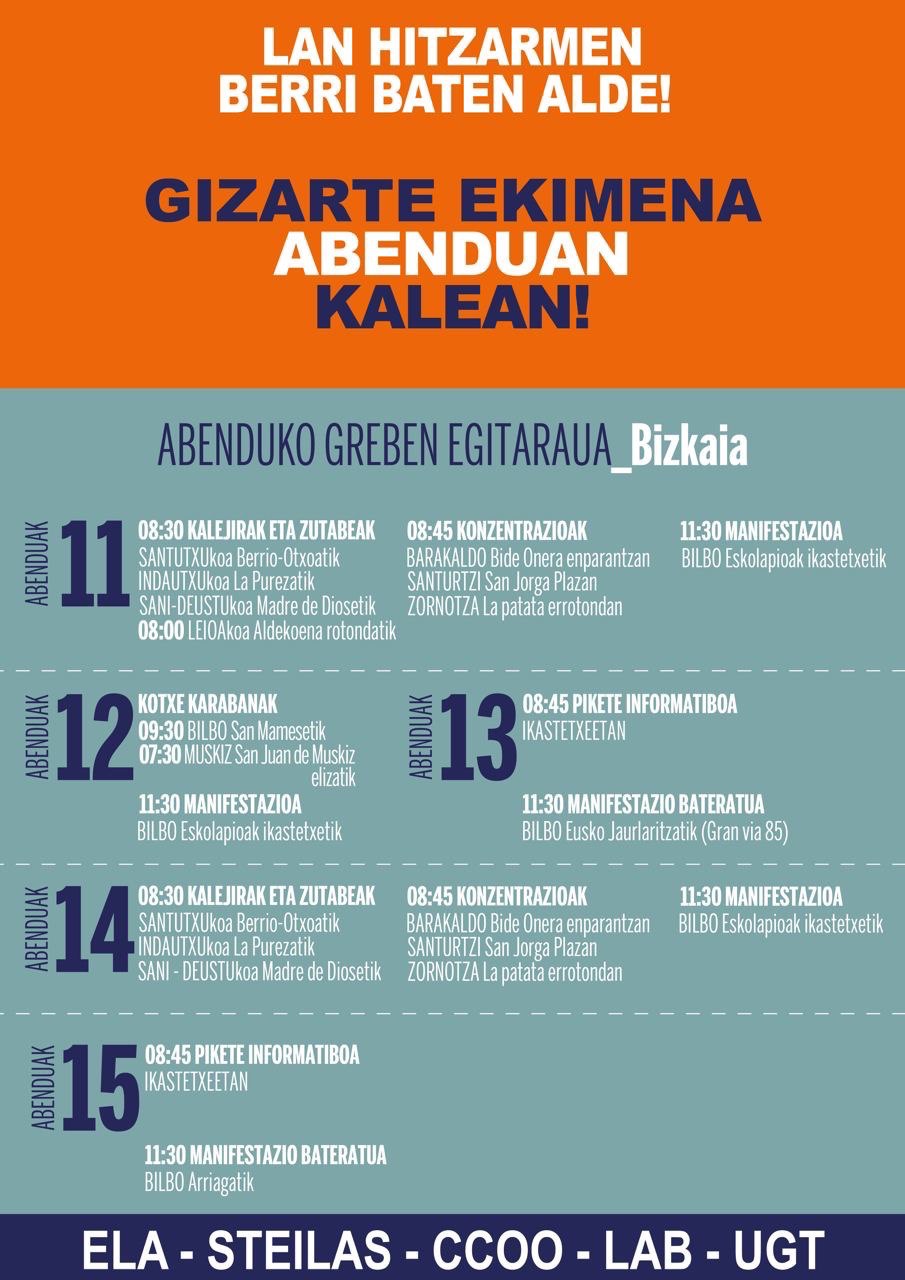 Igualmente, tienen claro que los movimientos que se han dado en las últimas semanas, la mesa convocada por las patronales para el 27 de noviembre y la reunión de hoy con el departamento son fruto de la dinámica de huelgas en marcha. Y que ese es el camino a seguir hasta que haya propuestas que hagan posible la firma del convenio.