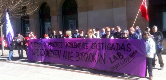 El 6 de marzo (a las puertas del 8 de marzo) las mujeres mayores y pensionistas de LAB se concentraron frente a la Diputación de Navarra para denunciar tres cuestiones importantes que afectan actualmente a las mujeres mayores: la precarización y el empobrecimiento de las mujeres hacen imposible que podamos vivir y decidir con autonomía, una salud que nos cuesta más y unos niveles de salud que son peores entre las mujeres mayores y las mujeres mayores y pensionistas tenemos más riesgo a la hora de perder calidad de vida y sufrir malos tratos. Para cambiar esta situación, LAB entregó al Gobierno de Navarra un conjunto de medidas para su aplicación.