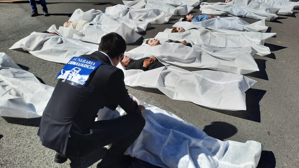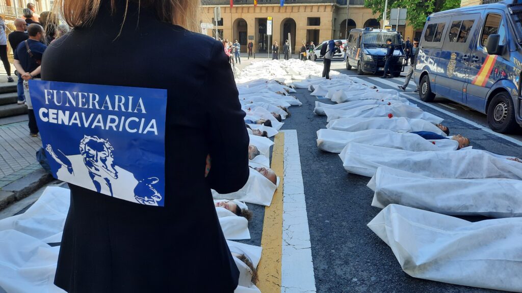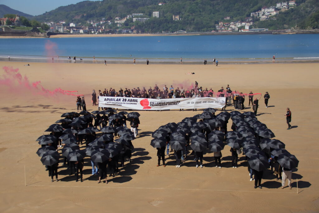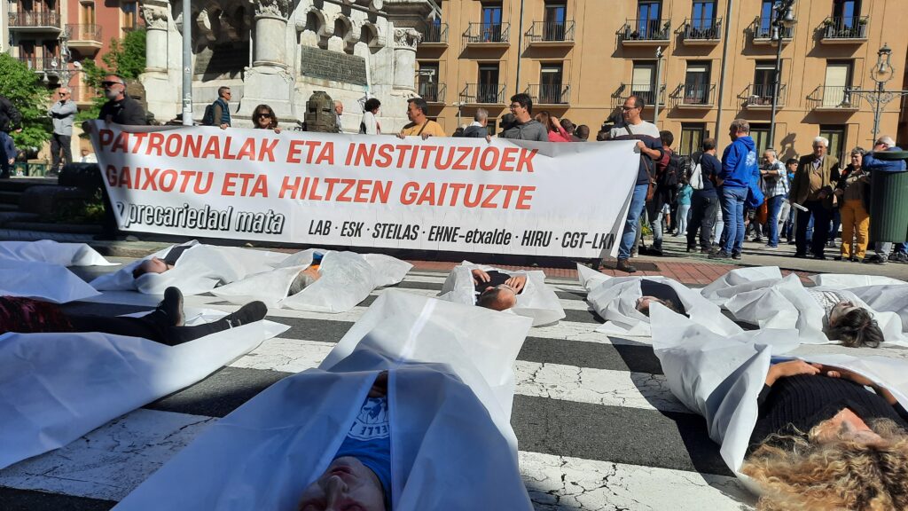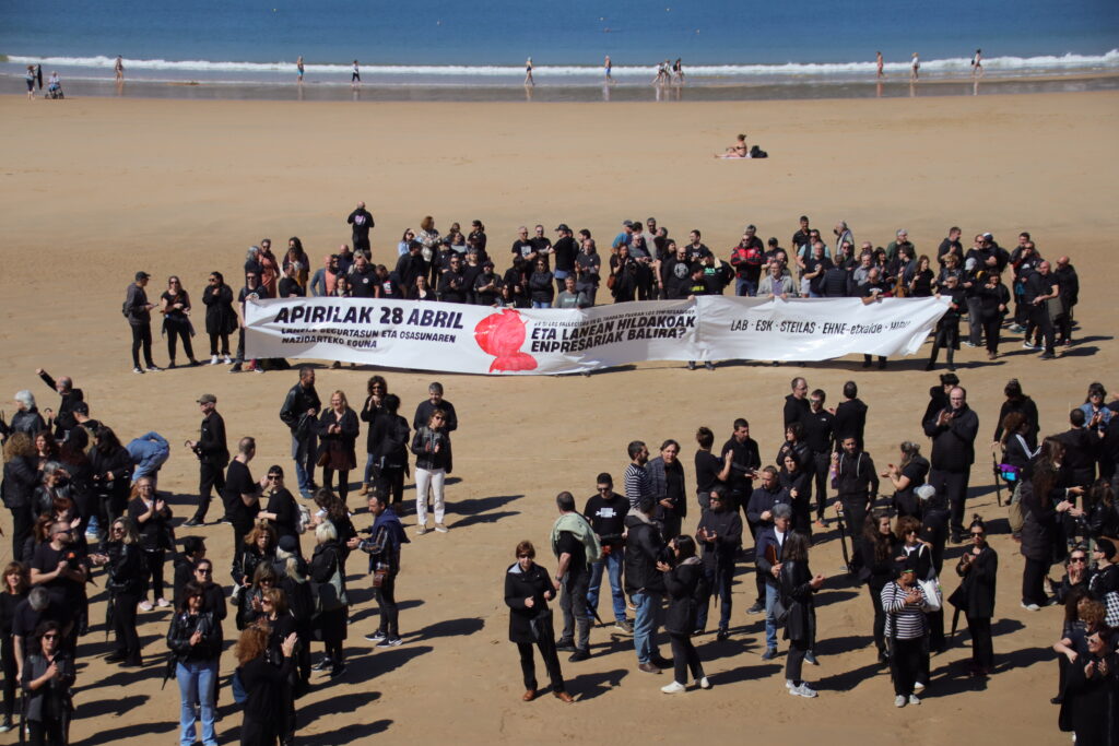 En Iruñea, han llevado a cabo una llamativa acción en el Paseo de Sarasate, representando la muerte de 64 trabajadores en accidentes laborales el año pasado. Frente al Palacio de Navarra y la Inspección de Trabajo, han escenificado a las y los trabajadores fallecidos tumbados en el suelo. En Donostia también han recordado los accidentes mortales del pasado año con un gran mosaico en la playa de la Concha. En ambas movilizaciones han denunciado la doble moral y la falta de humanidad que, según dicen, demuestra la patronal frente a los accidentes laborales.