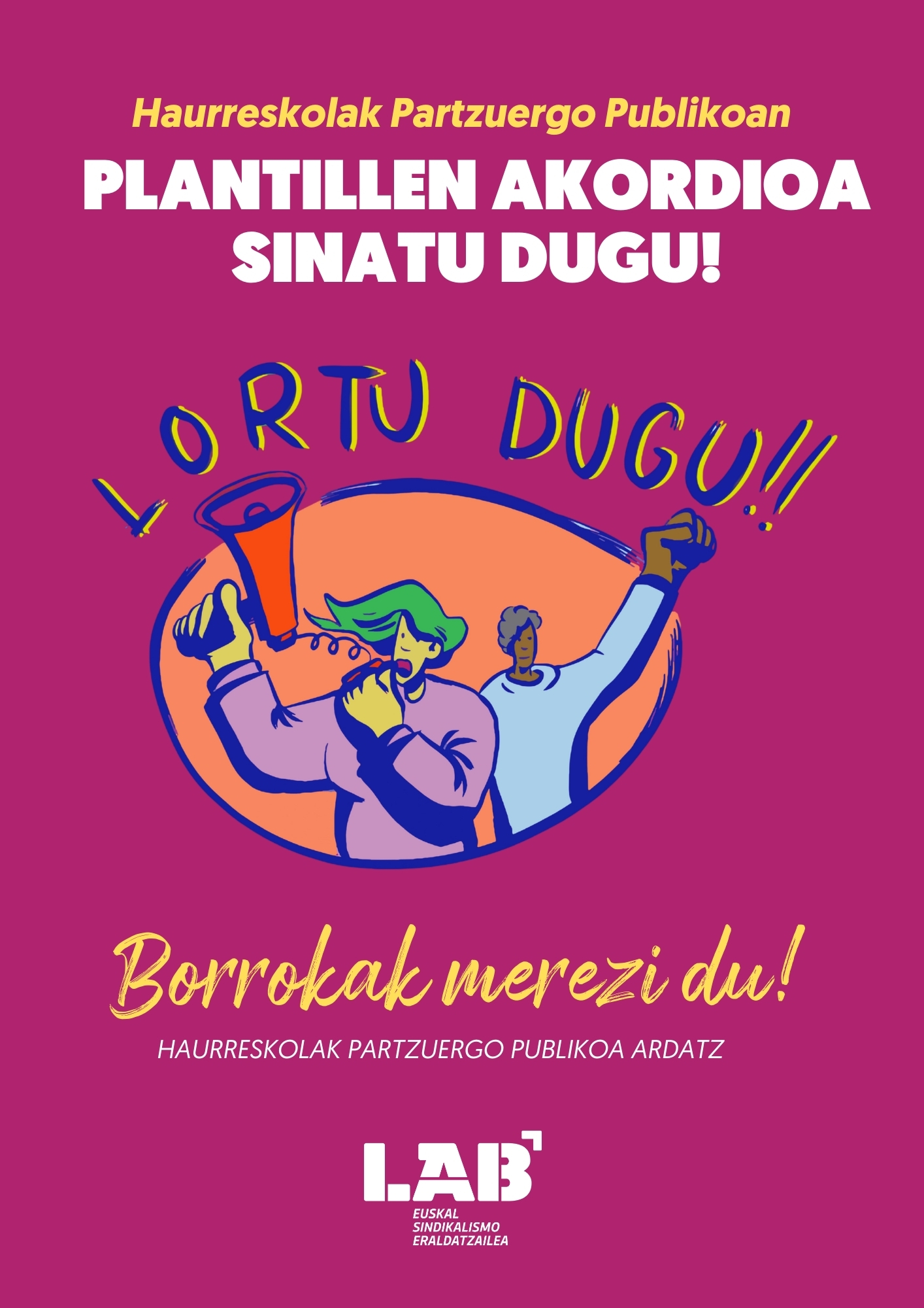 Además, El 10 de febrero de 2025 LAB firmó un acuerdo que puso fin al ciclo de huelgas y movilizaciones del año pasado. Hoy, el preacuerdo sobre el convenio colectivo del Consorcio Haurreskolak se ha convertido en un convenio definitivo con la firma de LAB.
