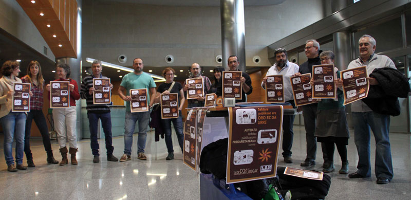 Dentro de la campaña #OROezdaURRE (no es oro todo lo que reluce) para luchar contra la precariedad LAB ha puesto en marcha una nueva iniciativa. Para dar un impulso a los cuestionarios que está trabajando con el fin de detectar las situaciones precarias ha presentado la “Kaiera” o cuaderno para que las y los trabajadores dejen sus opiniones.