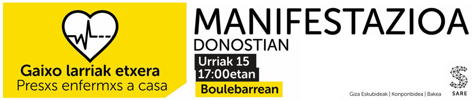 Desde el punto de los derechos humanos y la resolución del conflicto, reivindicamos el fin de la dispersión y la vuelta a casa de presos, presas, exiliados y exiliadas, desactivando la legislación de excepción. En este sentido, la vuelta de a casa de los y las presas con enfermedades graves es fundamental.