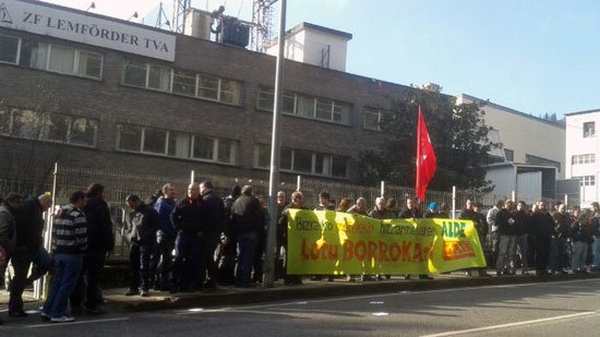 El sindicato LAB se ha concentrado, hoy 4 de diciembre, ante la empresa ZF LEMFORDER TVA S.A. Cuyo Gerente JULIAN HERNANDO ARCARAZO, representeante de la Asamblea general de CEBEK y miembro del FVEM, en demanda de un nuevo convenio del metal para Bizkaia.