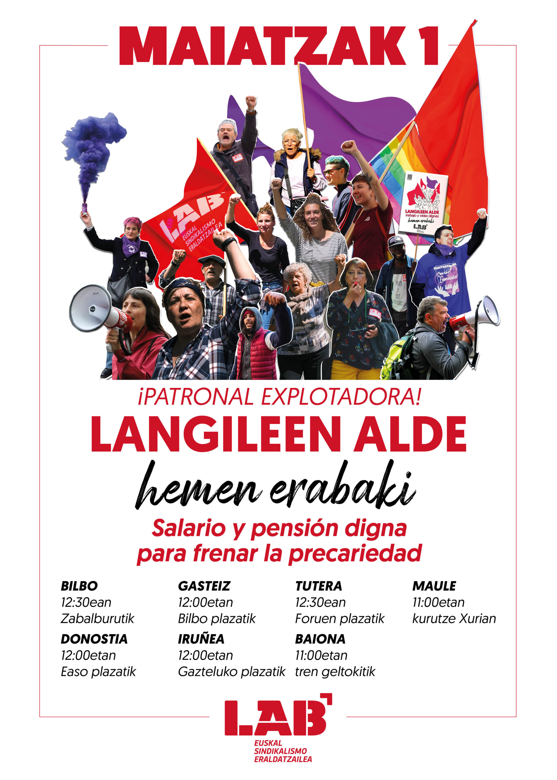 Asimismo, LAB hará hincapié en la aportación del sindicalismo independentista al reconocimiento nacional y al derecho a decidir en este Primero de Mayo, porque tiene claro que es necesario para repartir el empleo, los cuidados y la riqueza; para construir un nuevo modelo socioeconómico que ponga la vida en el centro.