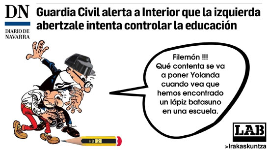 LAB, STEE-EILAS y ELA denuncian y califican de especial gravedad el artículo publicado en el Diario de Navarra y titulado "Guardia Civil alerta a Interior que la izquierda abertzale intenta controlar la educación", ya que recuerda "a las purgas que elaboró el franquismo en las escuelas" elaborando "listas negras".