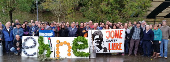 Biltzarraren amaieran, talde argazki hau atera genuen, bertan Jone Amezaga EHNE Bizkaiko kide baten alaba LIBRE nahi genuela aldarrikatu genuen, bere aurkako montai polizial baten ondorioz kartzelaratzeko agindua eman dutelako.