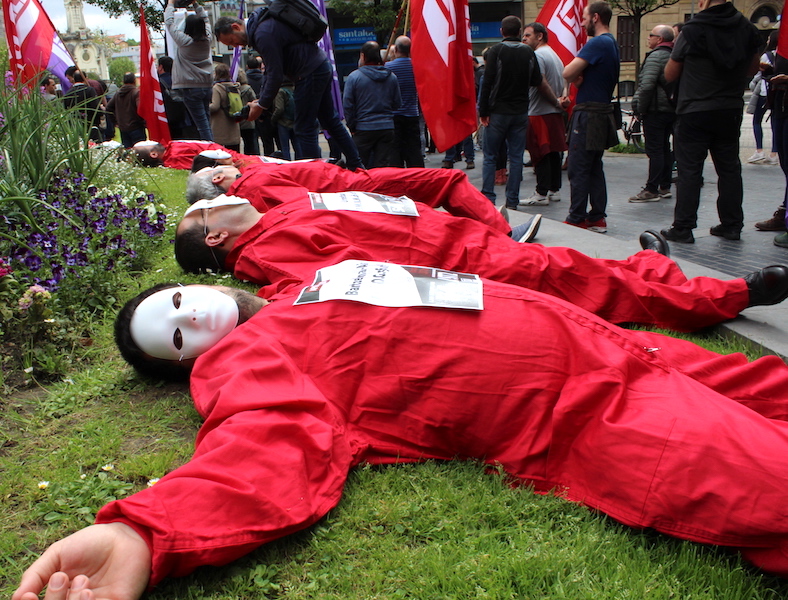LABeko idazkari nagusi Garbiñe Aranburuk adierazpenak egin ditu Donostiako mobilizazioan, buzo gorriz jantzitako 15 lagunen aurrean, iaz Gipuzkoan hildako langileen isla: "Laneko gaixotasunen inguruko errealitatea agerrarazi nahi izan dugu, hauek baitira, lanean gaudela jasaten ditugun osasunaren galeren aurrean, izkutuen geratzen direnak. Hor badaude datu batzuk oso esanguratsuak direnak, iturriak gorrituz irudikatu nahi izan ditugunak".