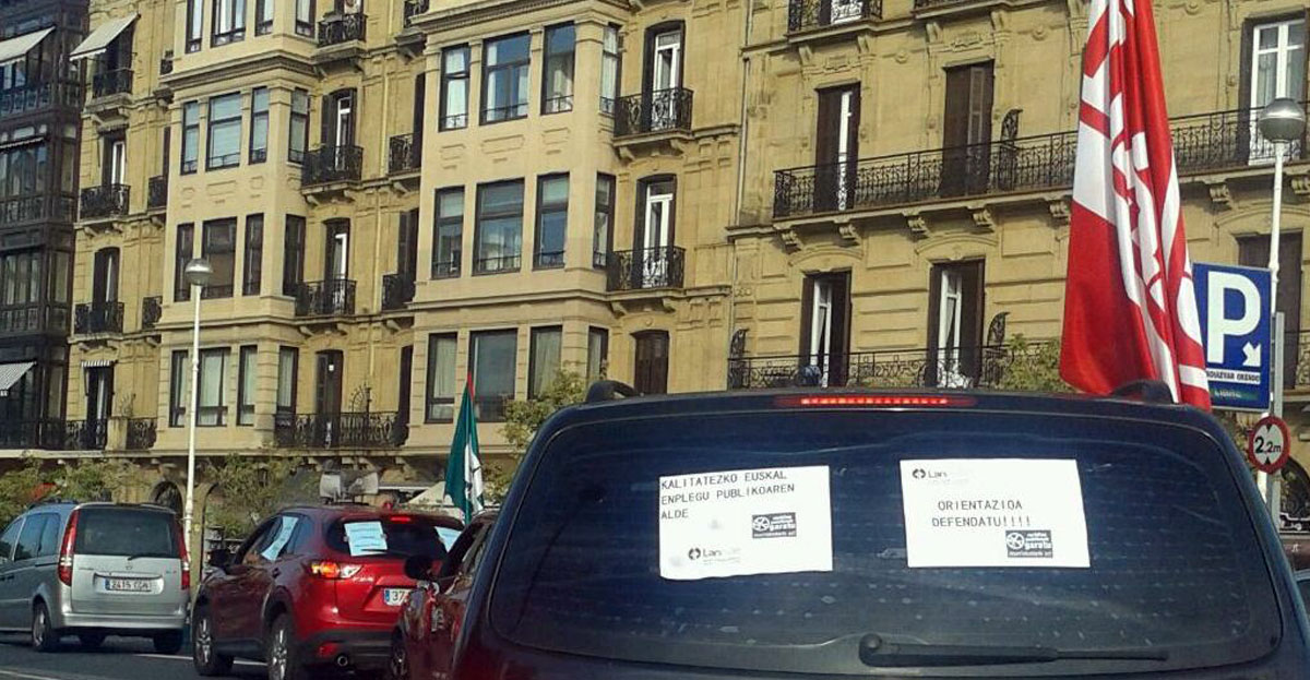 Urriaren 3, 4 eta 5ean greba dago deituta Lanbiden. Gaur Donostian mobilizatu dira langileak Groseko Lanbideko egoitzaren aurrean. Aurretik kotxe-karabana egin dute. Bihar, urriak 5, kotxe-karabana egingo dute Gasteizen eta 11:00etan, kontzentrazioa Lakuan.
