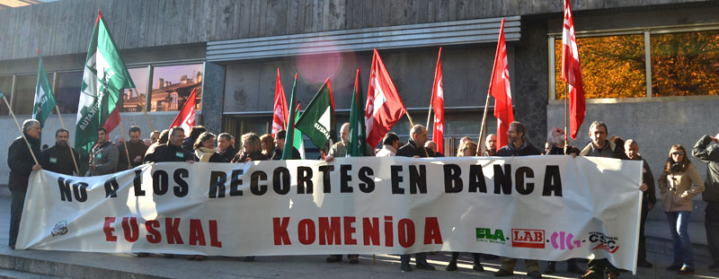 CIG, Intersindical CSC, ELA eta LAB kalean izan gara gaur AEBk Bankarako proposatzen duen hitzarmenak murrizketak eta prekarietatea dakartzaka salatu eta langileen eskubideak defentsarako Bankarako Hitzarmen propioak (Euskal Herrirako, Galiziarako eta Kalataluiniarako) exijitzeko.