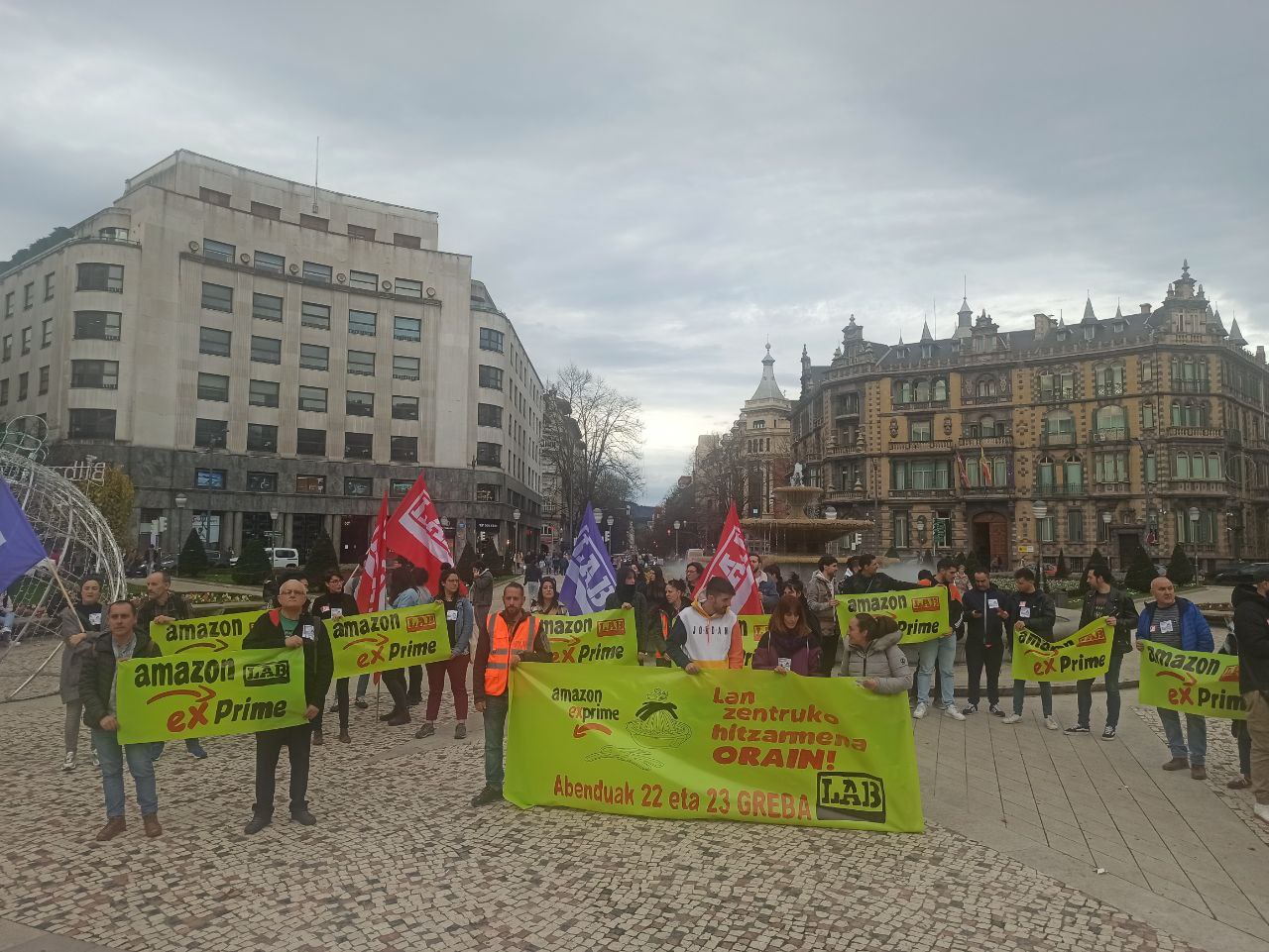 El día ha vuelto a ser histórico, es la tercera jornada de huelga en el centro de la multinacional en Trapagaran, tras los paros del 17 de octubre y la jornada de huelga de todo el día llevada a cabo el pasado 28 de noviembre. Una vez más, ninguna de las más de 300 furgonetas de las subcontratas de Amazon ha salido a repartir a las calles de Bizkaia porque las y los trabajadores del almacén han secundado mayoritariamente la convocatoria de huelga de LAB. En el día de hoy, la empresa ha acumulado un retraso de 25.000 paquetes, que sumando a los 35.000 que se prevé que no podrán repartir mañana, suponen 60.000 paquetes que no van a ser repartidos como consecuencia de la huelga. Hoy, las y los huelguistas se han movilizado en Bilbo, haciendo una kalejira desde la Plaza Elíptica a la Circular. Mañana, 23 de diciembre, segunda jornada de huelga de la semana, se movilizarán ante el centro de Trapagaran a partir de las 8:00.