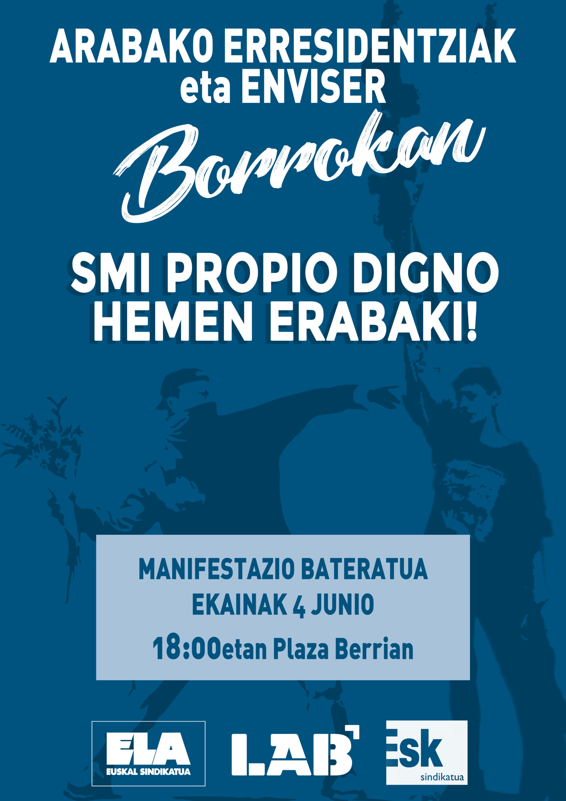 Así las cosas, los sindicatos LAB, ELA, LAB y ESK llaman a la manifestación conjunta del día 4 de junio a las 18 horas desde la Plaza Nueva de Gasteiz. Por un lado, para apoyar las luchas de las residencias de Araba y de la plantilla de Enviser. Por otro lado, y unido a ello, para reivindicar un Salario Mínimo Interprofesional propio y digno que acabe con la precariedad en Araba.