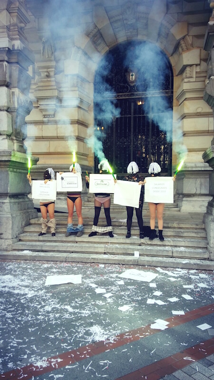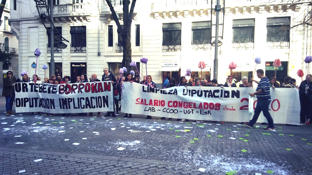 Hoy se cumple un año desde que las trabajadoras de Garbialdi decidieran poner en marcha movilizaciones en demanda del convenio. Cinco trabajadoras de la plantilla encargada de la limpieza de los edificios de la Diputación de Bizkaia han protestado porque, tras 9 años de congelación salarial, "Garbialdi y Diputación las dejan en bragas". Mañana los responsables de la Diputación les recibirán para escuchar la situación del conflicto. La empresa, por su parte, les ha citado para el próximo martes, 11 de diciembre.