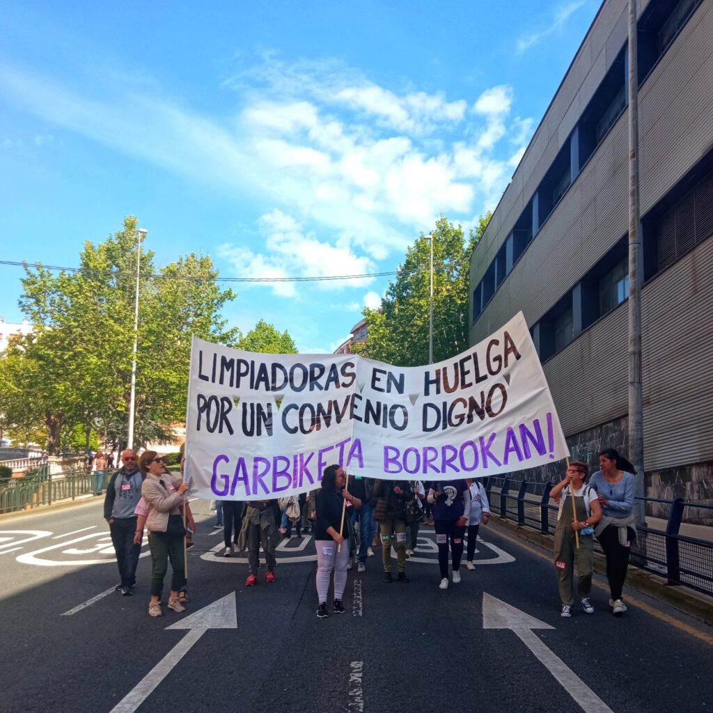 Las trabajadoras de limpieza de Bizkaia han convocado huelgas para los días 26 y 27 de abril y los días 10, 11 y 12 de mayo en defensa de un convenio digno. Antes, el 31 de marzo, secundaron otra huelga; la primera. Diferentes movilizaciones se han sucedido a lo largo de la mañana y, por la tarde, en solidaridad con las huelguistas, el colectivo Gora Garbitzaileak llevará a cabo un encierro en el local que Hika Ateneo tiene en el Casco Viejo de Bilbo. Van a pasar la noche allí.