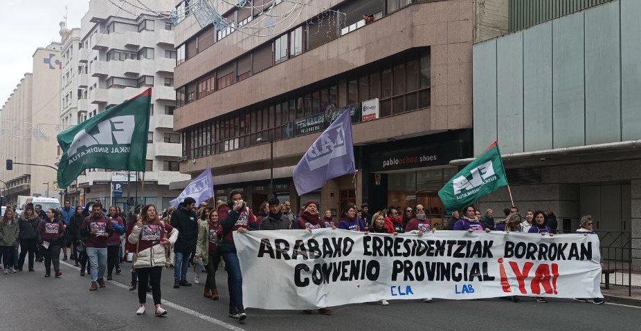 Las trabajadoras de residencias de Araba han convocado tres jornadas de huelga, los días 8, 9 y 10 de noviembre, en defensa de un convenio provincial. Hoy se han manifestado en Gasteiz, desde la Plaza Nueva hasta la sede de Diputación Foral de Araba, donde han realizado una cacerolada.
